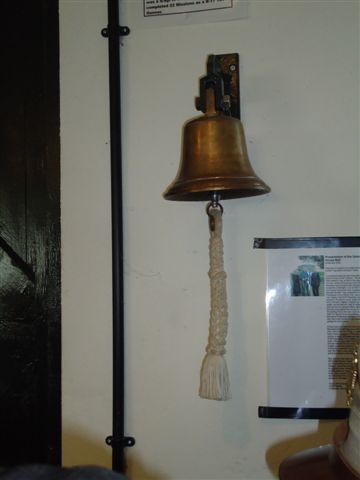 I understand that this bell once stood at the guard house at RAF Debach. The story, as it was related to me, is that in the years after the war, some of the airmen from RAF Bawdsey were occasionally temporarily posted for a fortnight or so at RAF Debach, and that at some time they undertook to liberate the bell. They presented it to the Felixstowe Ferry Sailing Club, just across the river Deben from RAF Bawdsey, where it served in the bar for many years. During that time, the bell's clapper clapped out, so to speak, so the barman used to whack it with a hammer for the desired effect, which is why the bell is somewhat the worse for it. When the Sailing Club's bar was razed to make room for fancier accommodations, Mr. John Kennell of Felixstowe salvaged it from the skip that it had landed in, and stored it in his garage for some years.